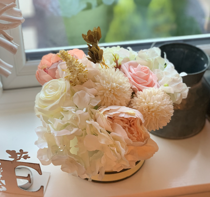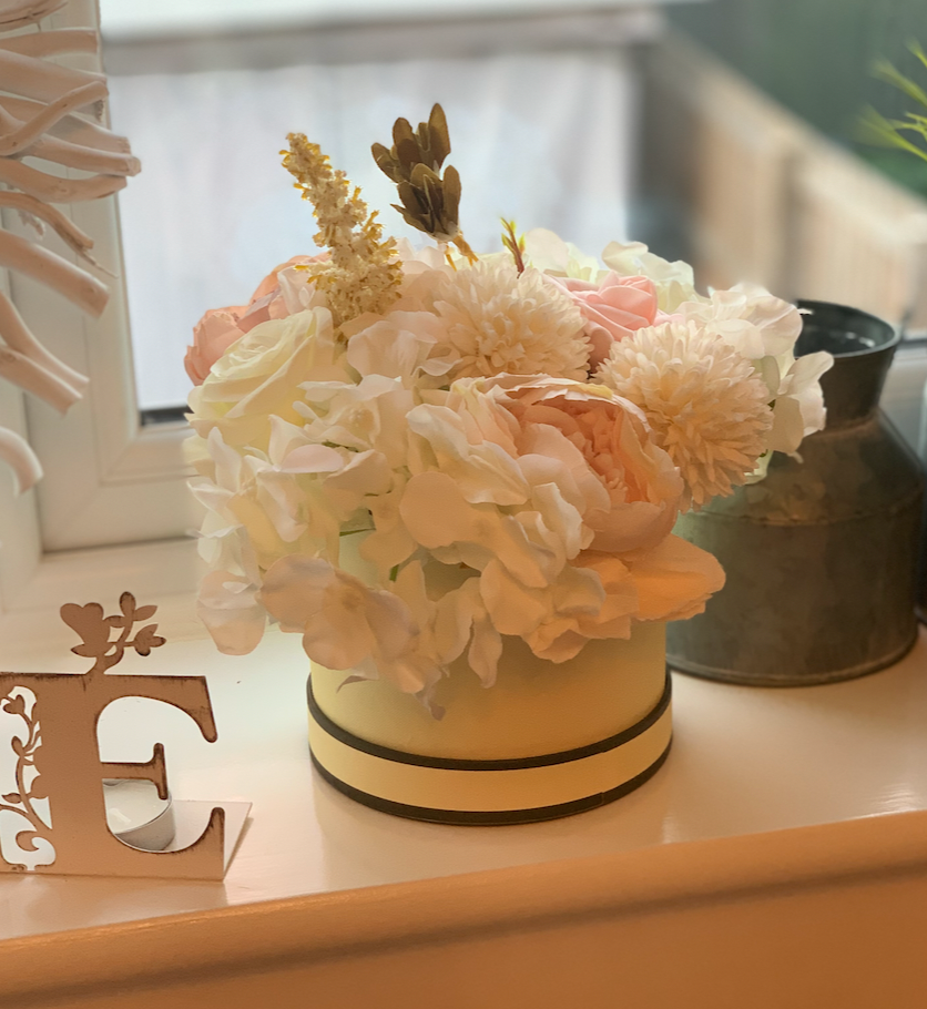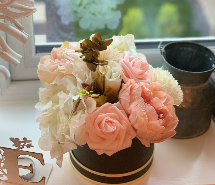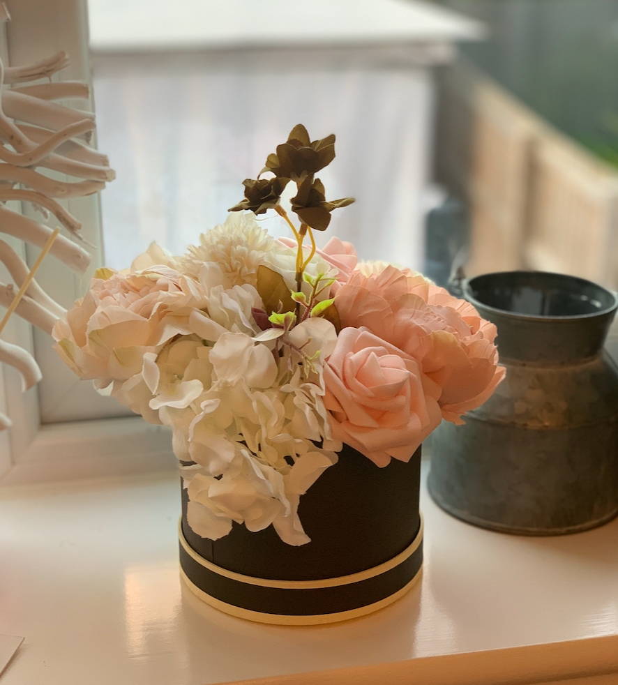 This charming small hat box features a beautiful handmade mixed faux flower arrangement, including roses, carnations, peonies, and hydrangeas. Perfectly crafted in various colours, it adds a lovely touch to any room or makes a thoughtful gift. Its elegant design ensures lasting beauty and a warm, cheerful vibe wherever it’s displayed.