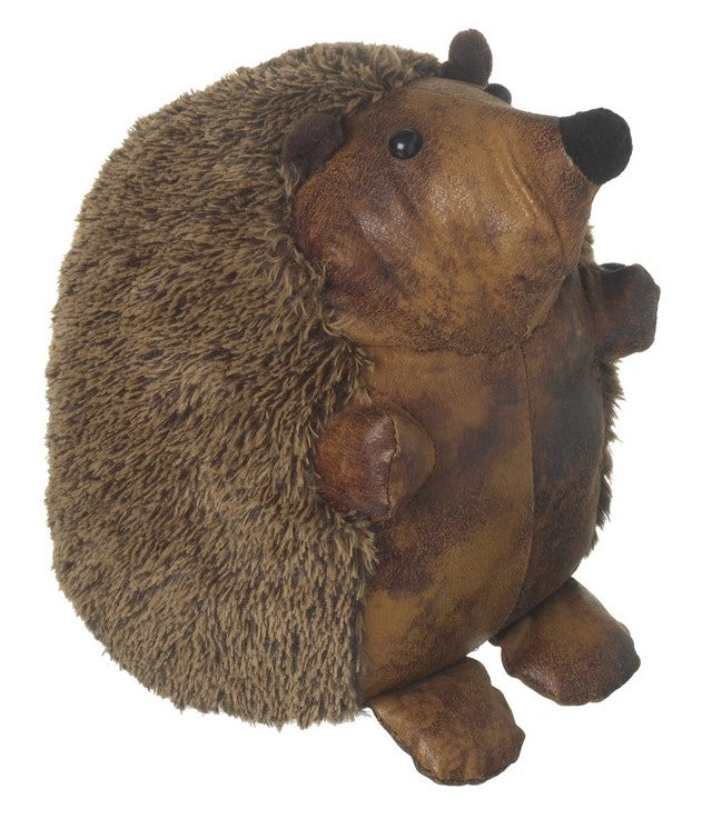 A delightful little faux leather hedgehog doorstop complimented by faux fur spikes