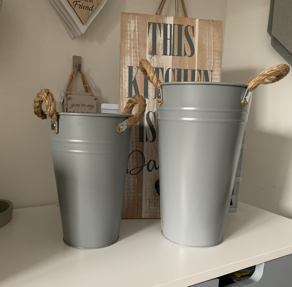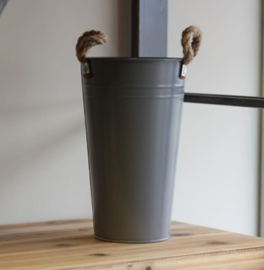 A rustic living flower bucket in grey. Complete with chunky rope handles.