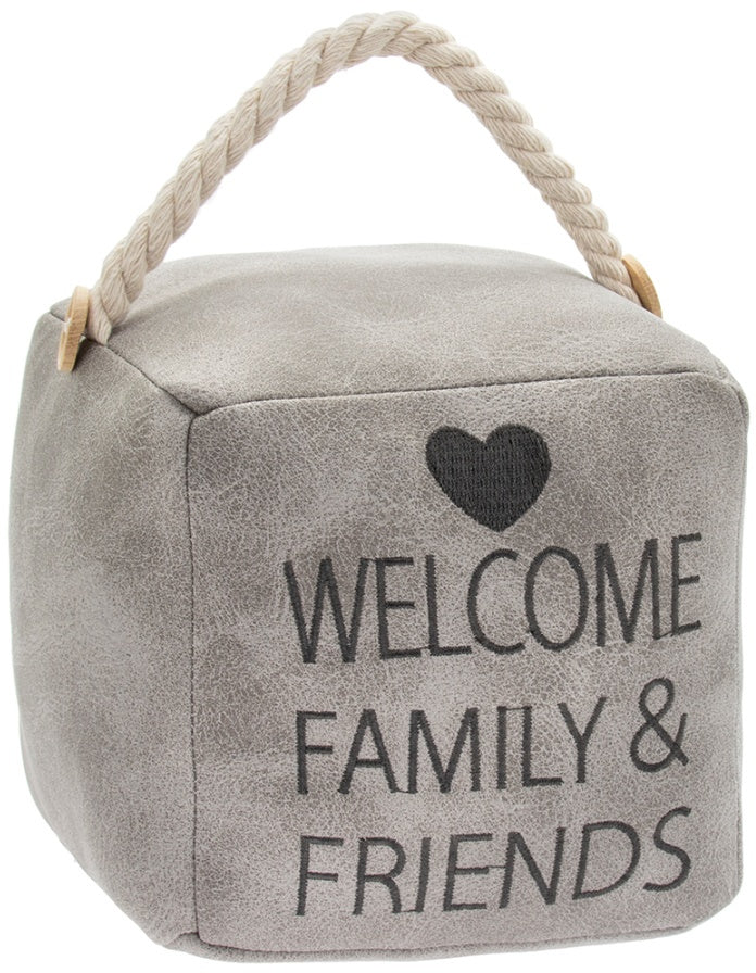 GREY FAUX LEATHER SQUARE DOORSTOP 'WELCOME FAMILY & FRIENDS'