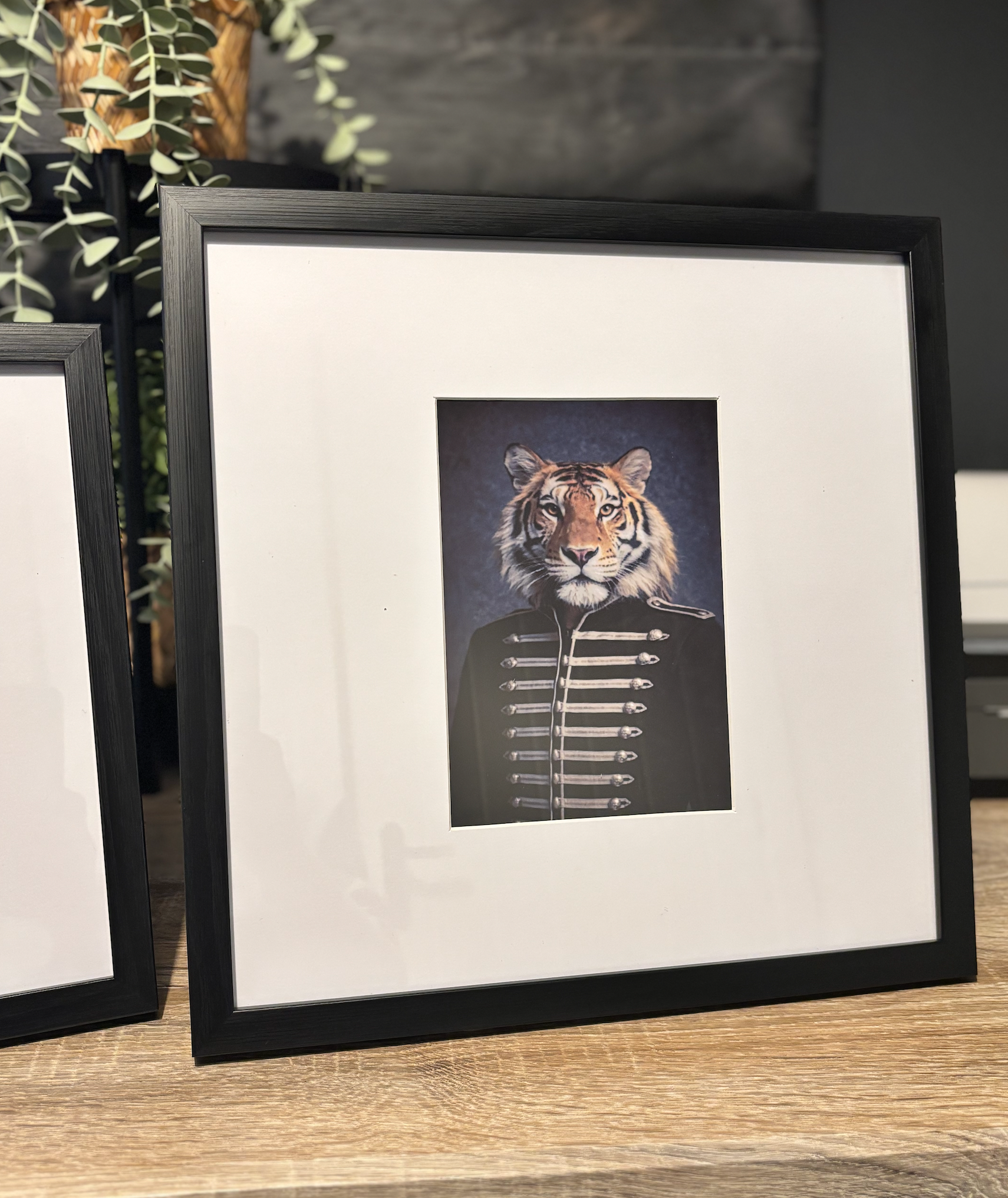 Bring wild elegance into your space with this framed tiger art. Featuring a detailed tiger head with military undertones, the piece combines artistic detail with contemporary style. The generous oversized mount provides impact and presence on any wall, making it an excellent choice for those seeking distinctive décor that reflects personality and taste. A timeless addition to modern interiors.
