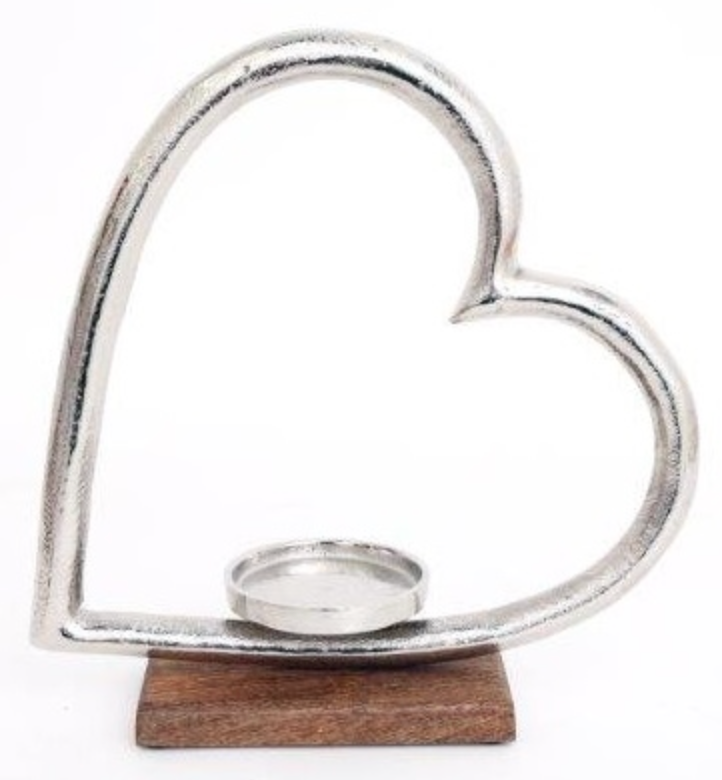 Large Heart Wood & Aluminium Candle Holder