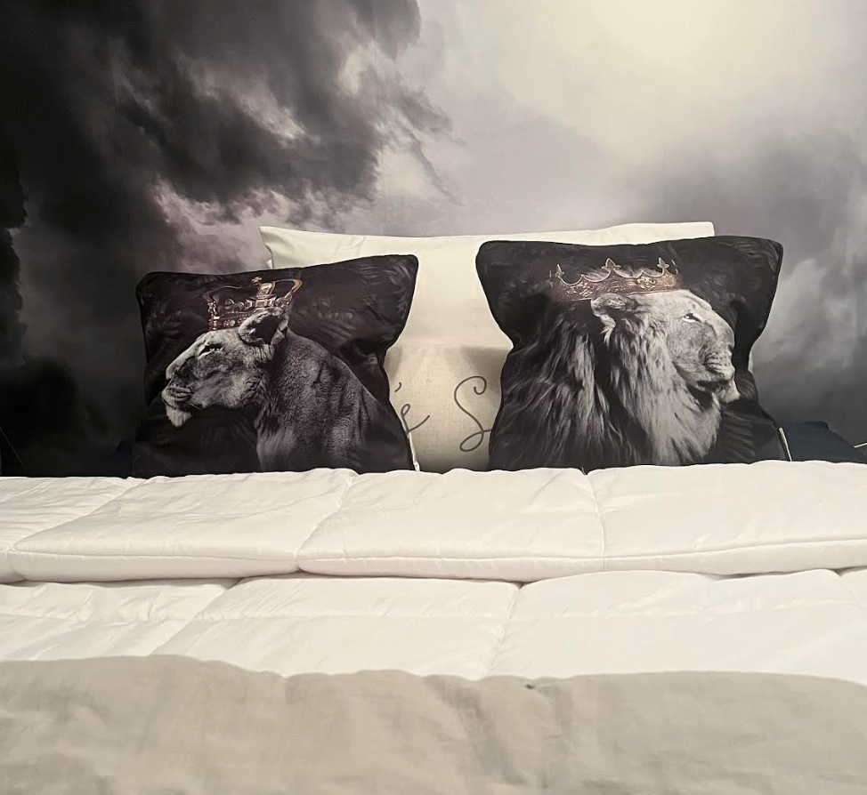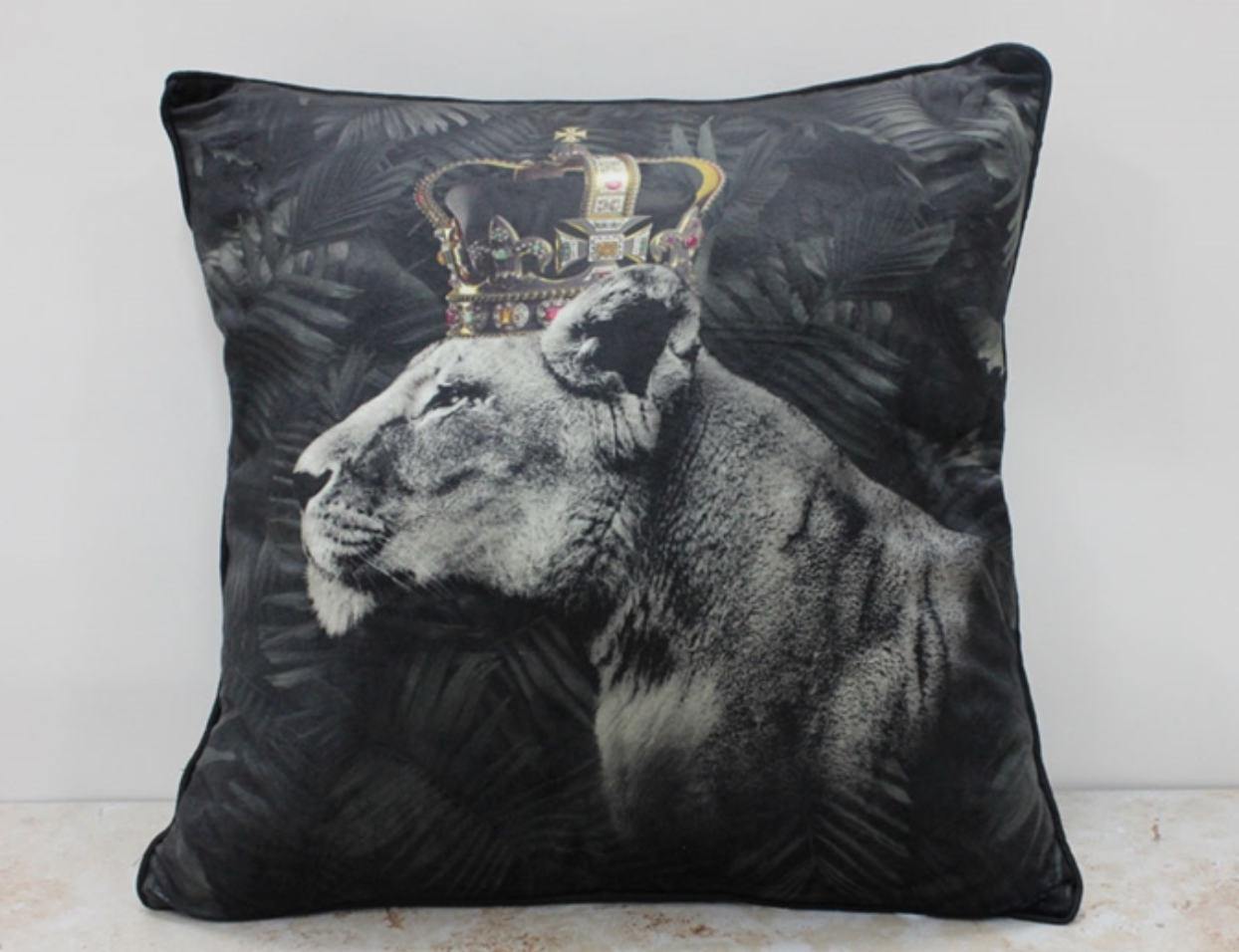 Square Plush Cushion With a Monochrome Lioness Wearing Crown Design
