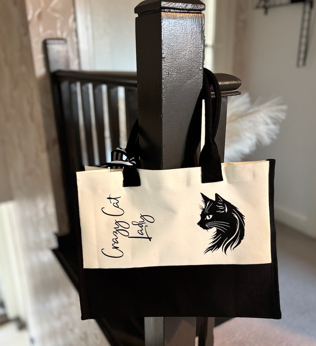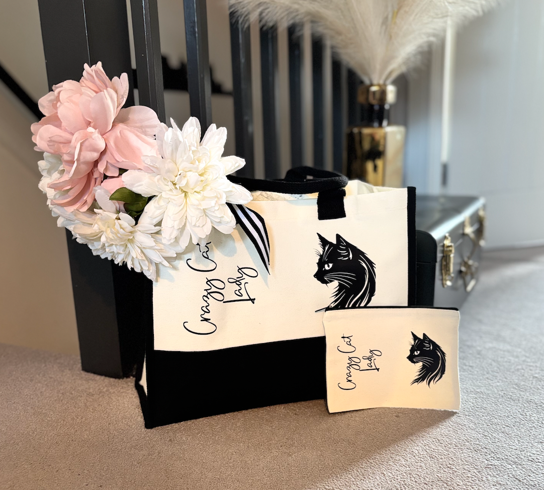Elevate your style with our Luxury Crazy Cat Lady Tote bag and matching make-up bag. Perfect for organizing and carrying all your essentials while showcasing your love for cats. The spacious tote bag and convenient make-up bag make a perfect set for any cat lady on the go.