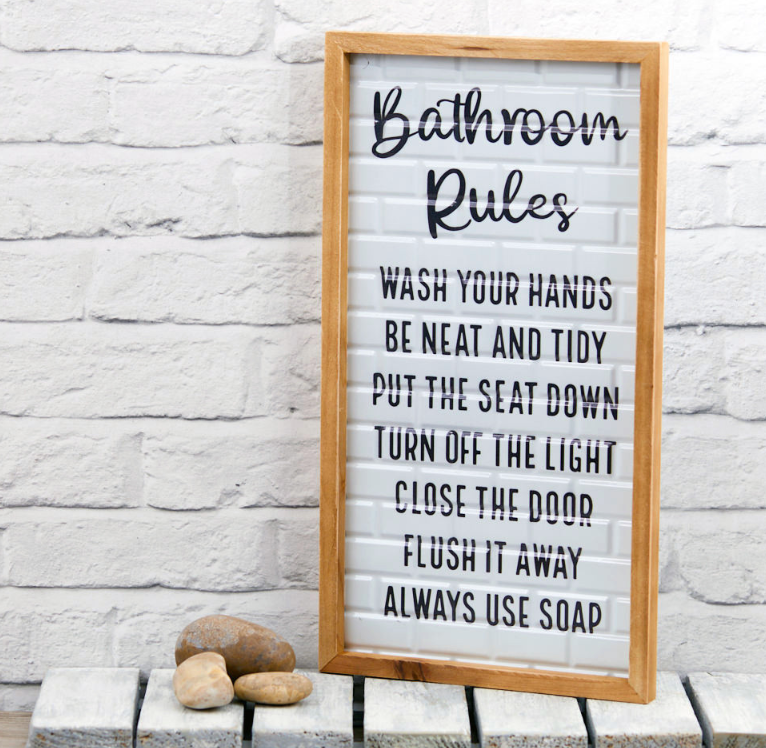Add a touch of texture and humour to your bathroom with our Metal Bathroom Rules plaque featuring a brick effect design. Perfect for the bathroom or ensuite, this fun plaque reminds guests of the rules with a quirky and playful tone. (Plus, it looks great on any wall!)