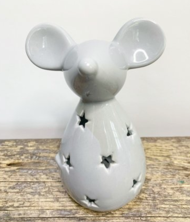 A charmingly simple ceramic mouse decoration with a sleek glaze and cut star decal. Place a T-light inside and watch the flickering flame project a charming starry shadow. A delightful little decoration to add to any home wanting a Cosy feature.
