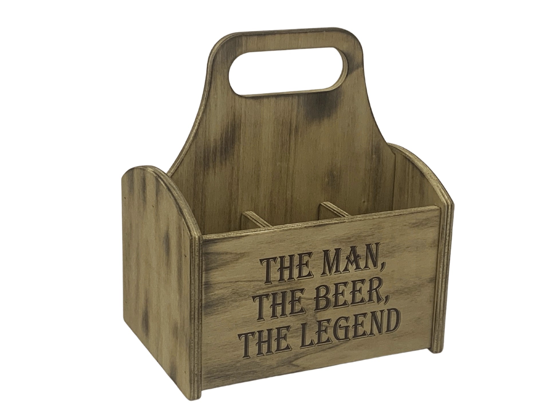 Introducing The Man, The Beer, The Legend Beer Caddy! This poplar ply wooden caddy boasts a rustic, aged look with a unique printed design on both sides. This caddy can hold up to 6 standard sized beer bottles or cans. Get your party started in style!