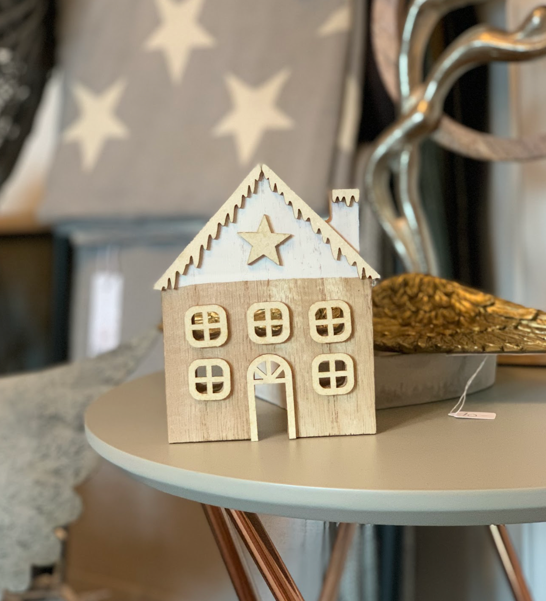 Add a winter touch to any home decor or christmas display with this chic wooden house decoration. Set in a light wooden tone and added white roof decor, this patterned window house will look perfect with any themed decor this season