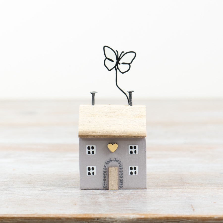 A gorgeous grey wooden house with decorative butterfly on the roof.